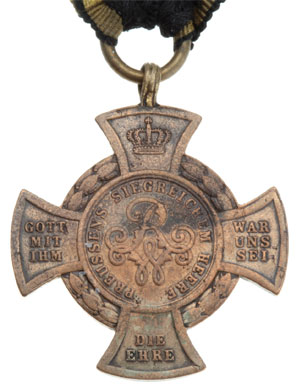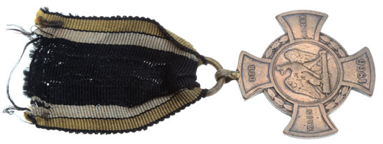 Main Armee Cross 1866: Prussian Austrian War, made from bronze cannons, 34 mm, 40 mm sewn ribbon, moderate wear.