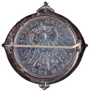 WW1 Patriotic Coin Brooch: Wilhelm II King of Prussia. Die struck solid silver cornucopia bezel with a gold plated Prussian crown, tab mounted with an undamaged German 2 Mark silver coin, natural iridescent blue toning, light wear.