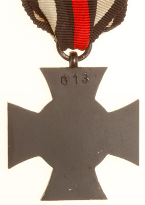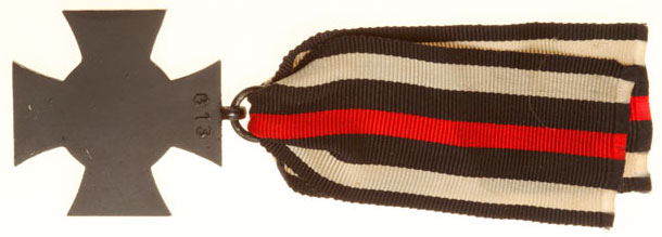 WW1 Hindenburg Cross, Next of Kin: Steel, magnetic, black gun-blue oxide, marked G13 on back, 14 cm ribbon, light wear.