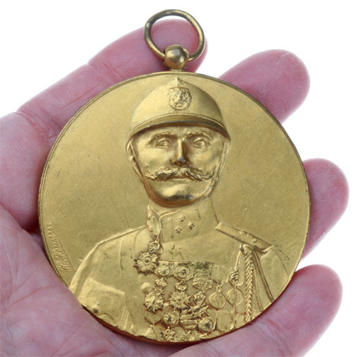 A La Memoire du Colonel Bourg: A Hero of the Great War (WW1), 18K Gold Merury Guilded tombac, 60 mm, edge marked J. Fonson, missing the ribbon, a huge and impressive medal, rare, light wear.