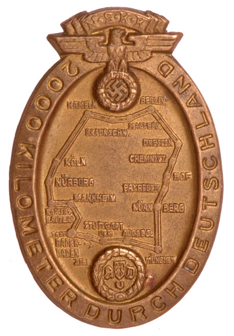 1933 NSKK ADAC 2,000 KM: Tombac, 42 x 28 mm, soldered brass pin, light wear.
