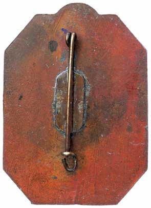 1933 SA Standarte Jager No. 7: Heavy large die struck tombac badge, 46x34 mm, brass pin secured to a soldered brass plate, multi-colored toning on back, light to moderate wear.