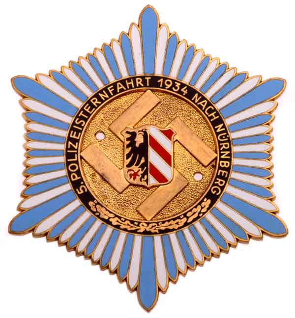 5. Polizeisternfahrt 1934 Nach Nurnberg: A late Midnight Rally Plaque (typically 10-12 PM when the sky should be filled with stars). Large enameled brass plaque, two mounting holes, 94 mm, maker "L. Christen Lauer Nurnberg - Berlin," excellent enamel, 98% gold gilding, minor discolorations, scarce, light wear.