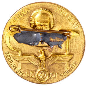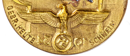 Stamped brass, 35 mm, soldered brass pin, maker: Gebr. Heute Schwelm, very lusterous, light wear