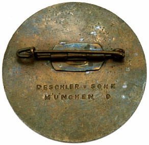 Bronze plated steel, 40 mm, brass pin, marked "Deschler & Sohn Munchen 9," quality maker, light wear.