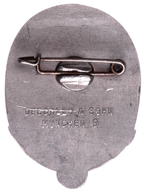 Die struck aluminum, 33x45 mm, press crimped steel pin, Deschler & Sohn Munchen 9, light to moderate wear.