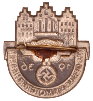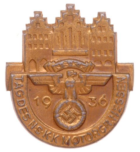Tag des NSKK Motorgruppe Hessen: bronze plated steel, gold/silver brennlack finish, 38x42 mm, strong soldered brass pin, light wear.