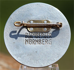 1936 Reichsparteitag: plated non-magnetic nickel alloy, 39 mm, bronze-plated magnetic steel plate and pin, seldom seen riveted pin plate, deep die pressed hallmark of Balmberger Nurnberg, moderate wear.