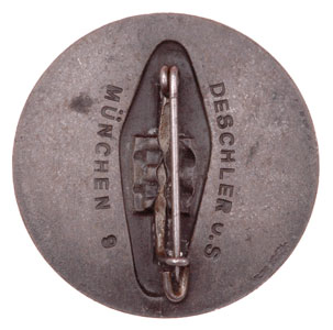 Zinc, 35 mm, crimp set steel pin, marked "Deschler und Sohne Munchen 8," light to moderate wear.