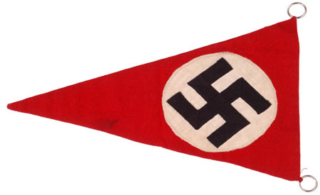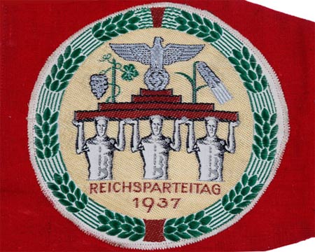 1937 Reichsparteitag Pennant: Double sided, 15x25x25 cm double red cloth bodies, 9 cm surged Roundel, two pc swaz; 9 cm surged Roundel with piping on the circumference, the RPD design has 6 colors of luminous rayon bevo-weave (white, black, brown, green, gold, and aluminum bullion), the eagle, grapes, and wheat are in two sizes of aluminum bullion, the two steel rings open up like on a key ring, these were very high quality pennants sold at the event in 1937, hard to find today, rare!, very light wear.