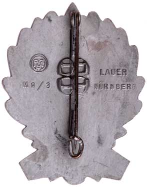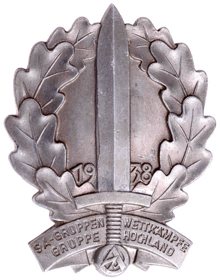 SA Gruppen Wettkampfe Gruppe Hochland 1938 : Aluminum, 50 x 40 mm, hallmarked "RZM 9/3" (Lauer Nurnberg), machine crimped steel pin, light wear.