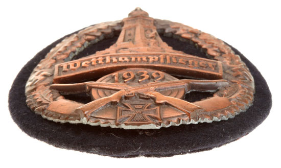 Kyffhauserbund Wettkampfsieger (competition victor) Shield: Cupal (copper-aluminum) shield 64 x 51 mm, dark blue wool covered vualted back plate 68 x 58 mm, glued to a navy blue wool backing, scarce this nice and complete!, virtually mint except for the back wool disk.