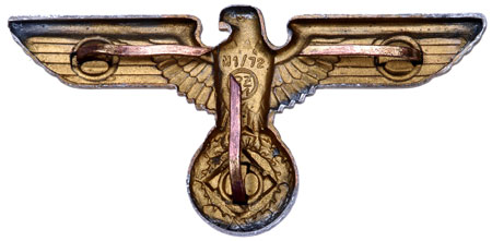 1939 NSDAP Gold Hat Eagle: Gold and copper plated and shellacked aluminum, 66x33 mm, plated and crimp set copper prongs, RZM M1/72 (Fritz Zimmermann, Stuttgart), light wear.