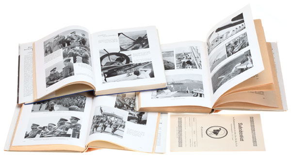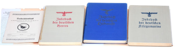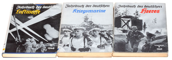 1940 Yahrbucher der Wehrmacht: German Airforce, Navy, and Army: Breitkopf & Härtel, Leipzig, 1940. cloth-hardcover, eagle & title impressed in colored ink, 17.75 x 24 x 1.9 cm, 184-6 pages in each, numerous glossy plates of photos in each, only damage comes from age: binder glue is brittle, paper pages starting to darken, dust jackets show minimal wear. Text is filled with backslapping celebration after the easy victories of the war they started in 1939. The rare cardboard storage box has some open edges in a few places from age and storage wear, still looks great. Includes Nachrichtenblatt pamphlet, Inf. Rgt. Nr 83; Kassel, Jan 1940, 28 pages, has many reports of the Polish campaign, 5 photos, 2 maps, mint.