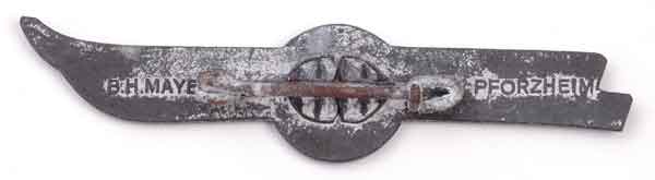 Zinc alloy, silvered finish, 55 x 13 mm, maker B. H. Mayer Pforzheim, brass pin with corrosion, moderate wear.