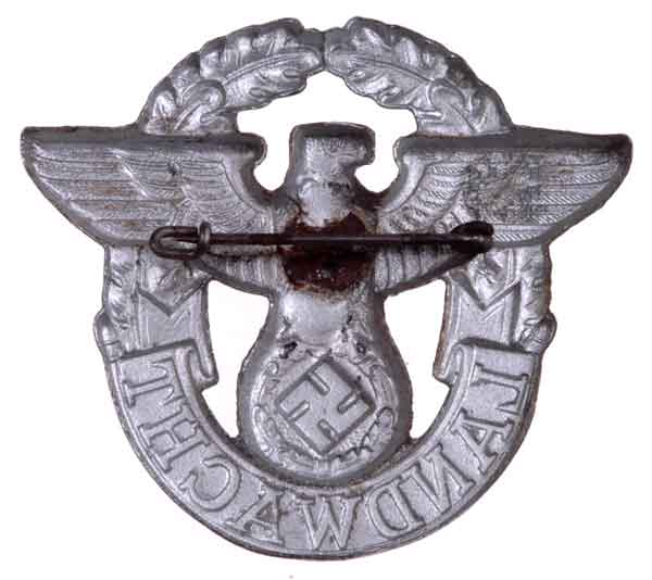 Landwacht (German National Watch - or Awake Police) used to guard prisoners of war on work details inside Germany. Die stamped zinc alloy badge, silvered finish, soldered steel pin, 52 x 45 mm, light wear.