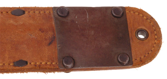 Super RARE Fighting Knife: 6.5 inch blued blade, marked US M3 KINFOLKS INC. 1943; stacked leather washers grip, bomb marked pommel, hand peaned tang, only 135,548 were made by this rare company, light wear. The even rarer leather sheath is marked US M6 MILSCO 1943, with 20 rivets, two steel plates, eight throat staples, supple leather, nice even color, light wear. A really magnificent original example of this ultra-rare maker!