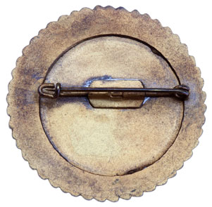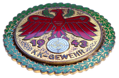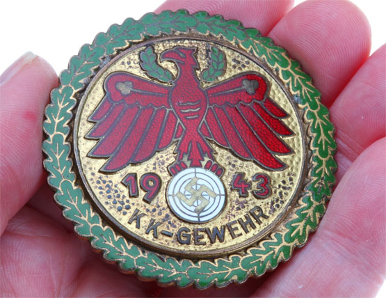 Klein-Kaliber, KK Gewehr: Enameled & Gold brennlack feinzink, three colors of enamel, gold plated swaz and target, lacquered, 52 mm, brass pin, unmarked C. Poellath Schrobenhausen, large, colorful, attractive, priced right, light to moderate wear.