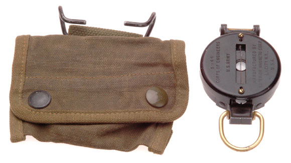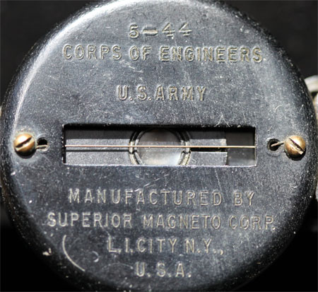 Probably the Best Compass Made in WW2: Made one month before D-Day, Blackened copper body, magneto damped dial, jeweled stem, glow in the dark radium painted letters on the dial, tempered glass crystal, two slots with a center wire for sighting, pop-up magnified lens for reading the dial, knurled brass bezel ring with clicker, marked 5-44 (May 1944) Corps of Engineers U.S. Army, manufactured by Superior Magneto Corp. L. I. City NY USA; comes with original canvas belt case, works perfectly well, very light wear.