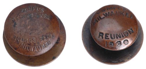 2 Red Arrow Division Lapel Pins: Copper, 16 mm, plain and painted, one reads: Complements Second Ward Savings Bank; the other: Compl's Milwaukee Reunion 1930; light to moderate wear.