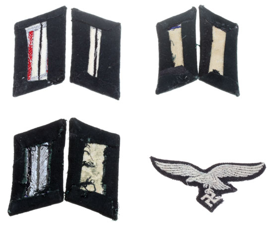 Collar Tabs & Eagle Lot: One artillery, two medical doctors ... ave moderate wear; Luftwaffe EM breast eagle (washed in modern detergent, positive to UV light) moderate wear with stains.
