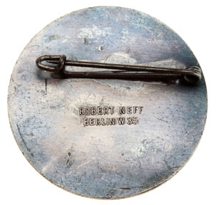 4. Reichsnahrstands Ausstellung Munchen 1937: Solid Aluminum, 38 mm, 7.9 gm, soldered steel pin, almost full lacquer, Robert Neff Berlin W35, very light wear.