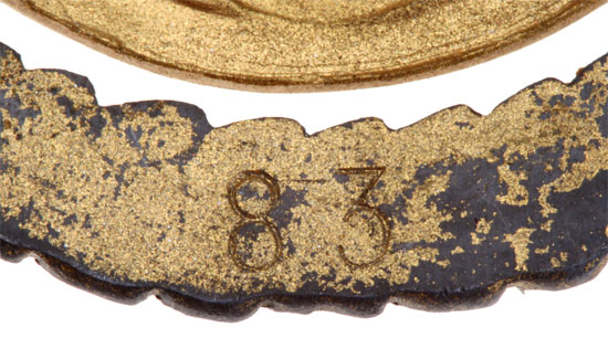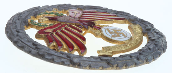 9 Yahre Gaumeisterschutze: The first "dark year," for a currently unknown gau, multi-colored enameled feinzink, two piece construction, 63 mm, gold and black brennlack finish, strong colors, wartime black wreath circa 1943 to mourn the Stalingrad disaster on the Eastern Front and the El Alamein disaster in Afrika, serial number 83, large chip to the eagles breast, a rare badge, overall light wear.