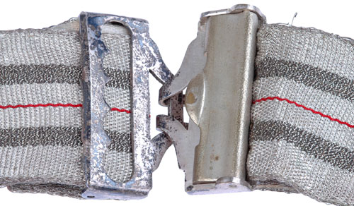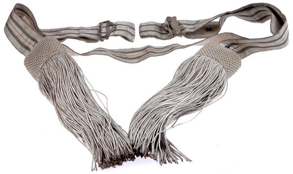 Sword Belt Sash: Adjustable brocade belt with a white cotton lining, two black stripes and one red for Anhalt, silver plated nickel buckle and keeper, two huge bullion knots and tassels, light wear.