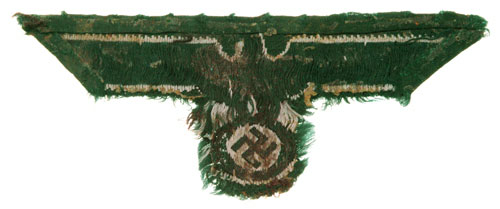 Army EM Tunic Eagle: Uniform removed, then taken out of a vet's scrapbook, grey bevo eagle on dark green rayon fabric, 100 mm, many upper stitches still remain, some paste on reverse, moderate to heavy wear.