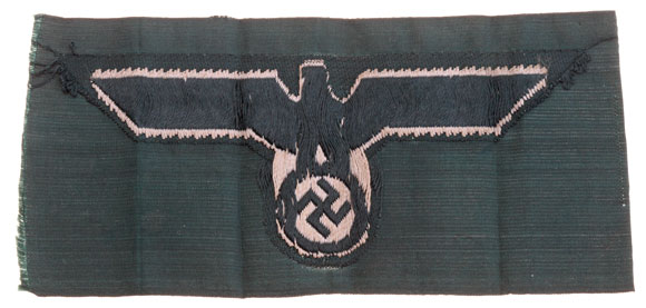 Army EM Tunic Eagle: 55 mm wide green rayon base, 9 x 4 cm grey bevo eagle, mint unissued.