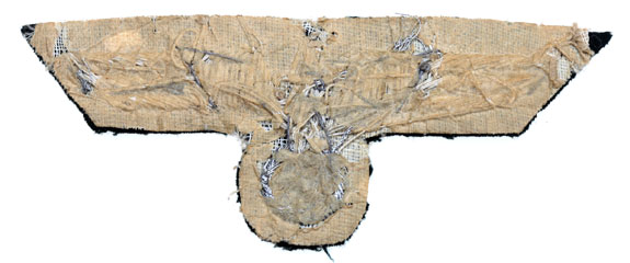 Army Officer Bullion Tunic Eagle: 9 x 3.5 aluminum bullion eagle on a 105 x 43 mm dark green wool base, glued paper backing, moth nips, repairable, unissued.