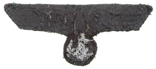 Army Officer Tunic Eagle: 95 mm, green wool on cloth base, aluminum bullion wire hand embroidered eagle, black paper backing, uniform removed, worn but light wear.