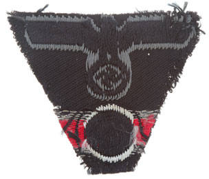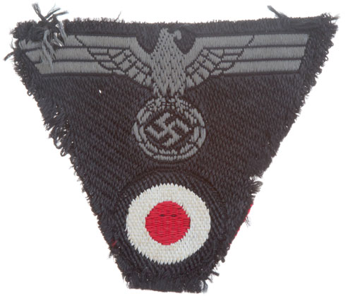 Army Panzer M43 Trap: Black rayon base, bevo weave, grey eagle, 45x55 mm, removed from cap, moderate wear.