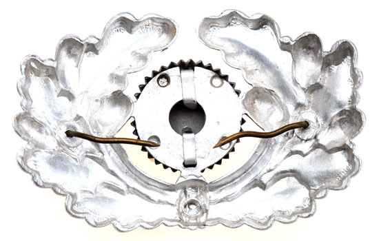 Army Visor Hat Wreath and Cockade: Aluminum wreath and roundel, nicely vaulted, red wool center, two strong machine crimped brass prongs, 65 x 40 mm, very lusterous, mint unissued condition.