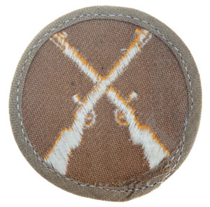 Unterwaffenmeister Patch: Tropical theater, 55 mm, brown cloth disk, machine embroidered gold rifles, light brown border, mint unissued.