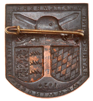 WW1 War Vets Reunion 1934: Tomback, 31 x 35 mm, brass pin, light wear.