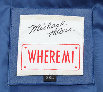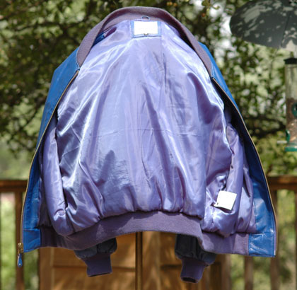 Blue Leather U. S. Air Force Jacket: Michael Hoban designer label, RN#20849, Size 3XL, blue rayon lining, embroidered gold & blue wool letters; huge 10 inch United States Air Force patch, two deep pockets with snap flaps, zippered left sleeve pocket with four pencil sleeves; elastic waist, arm, and neck cuffs, from the estate of USAF Colonel Hal Eardman, virtually mint condition.