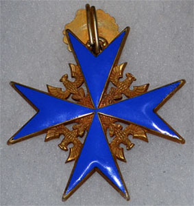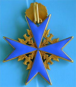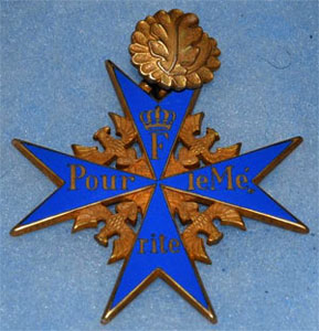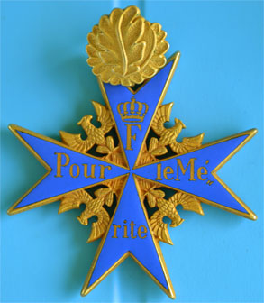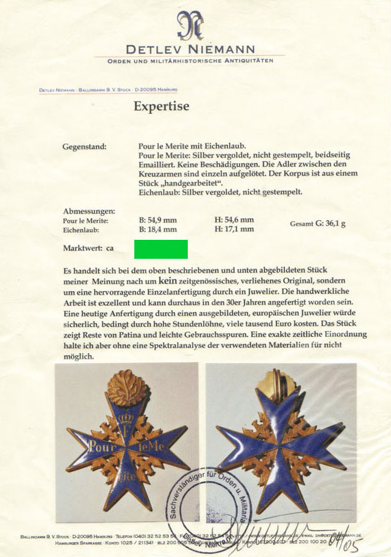 Blue Max - Pour Le Merite with Oakleaves: The body is one piece, 54.9 x 54.6 mm, handmade, gilded silver, enameled both sides, not marked, the four gilded silver eagles and half loop are seperately hard soldered to the arms of the cross. The oakleaves are gilded silver, 18.4 x 17.1 mm, not marked. Weight: 36.1 gm. Translation of expertise: high quality, jeweler made.