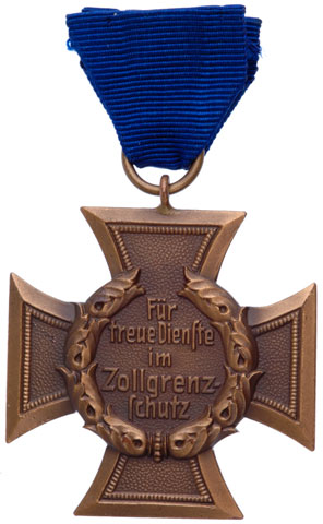 Zollgrenze - 1939 Border Protection Service Medal: Die struck tomback, 42 mm, 24.38 gm, 5 cm sample board ribbon, mint unissued condition.