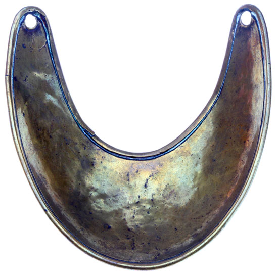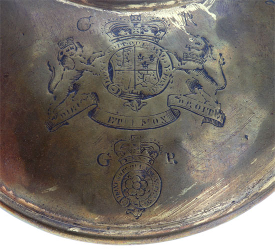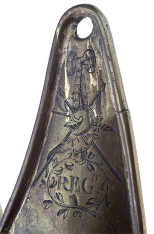 American Revolutionary War, Royal Fusiliers Officer's Gorget: The hand engraved Royal Arms is typical for a British gorget, but this one has some unique elements. Below the Royal cipher is the regimental Tudor rose inside a garter ribbon. The upper left of the gorget is engraved with VII-TH. within a wreath, suspended from a ribbon bow, a Roman breastplate before a scimitar, pike, and a club. The upper right is engraved with REGT. within a wreath, suspended from a ribbon bow, a Gallic helmet before a pole-axe, a guidon, and a dagger. Hand hammered solid brass, 4.25 x 4.25 inches, 51.95 gm, traces of mercury guilding, cloth and leather backing missing, acid etched engraving (the sign of a lower quality maker), moderate to heavy wear.