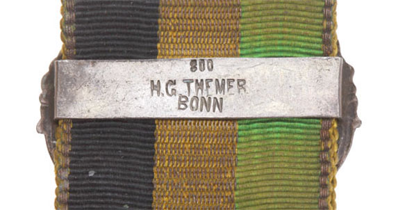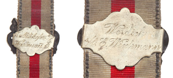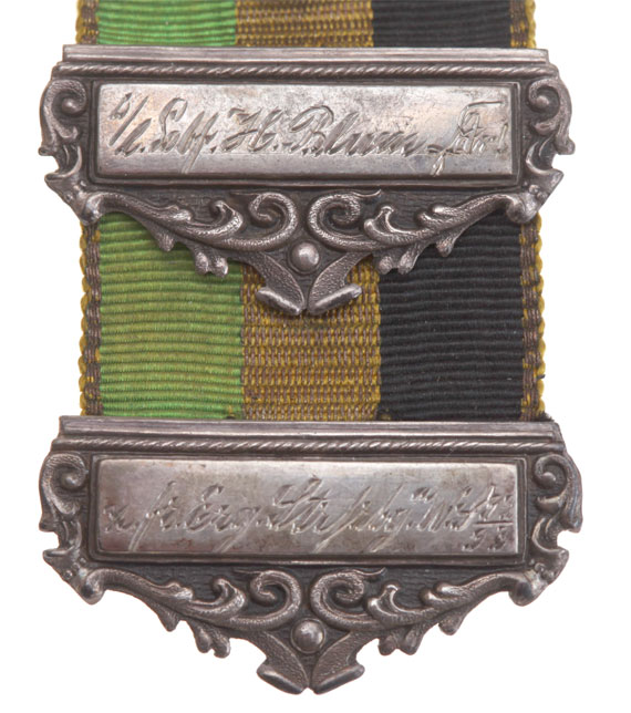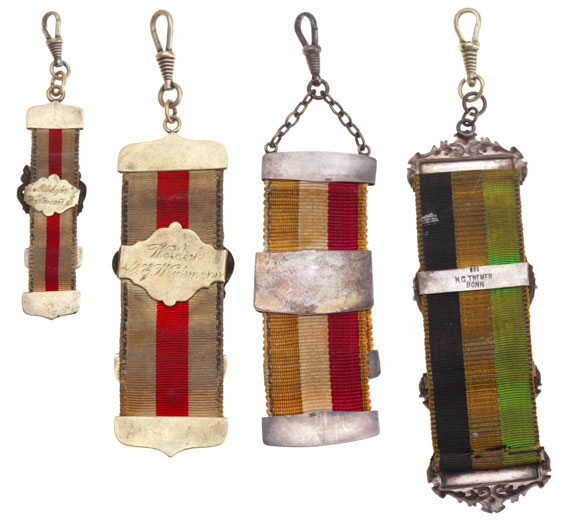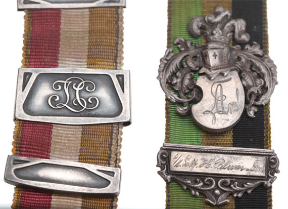 Unknown German Ribbons: Tri-color ribbons metallic borders, with decorative solid silver clasps, 10, 8.5, 8, and 6 cm long, swivel clips, inscribed with owner names, circa 1890's, light wear.