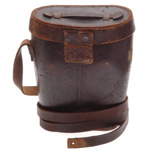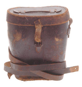 Hardshell leather case: 4 ft leather strap secured by a tab and two blued staples on each side, designed to hang over the shoulder to just below the belt line, short side tab on side is missing; excellent finger lift cover strap and blued buckle; buckle strap secured by two blued staples, tip worn away (two easy repairs).