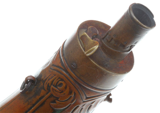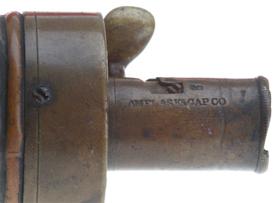 Corned Black Powder Flask: Brass and copper, circa 1850, 7.5 inches tall, high relief fluted clamshell design, marked "AM FLASK & CAP CO" on the nozzle, lift and twist nozzle measures four amounts of powder (2.00, 2.25, 2.50, 2.75 drams); uncleaned, lever and nozzle all in working order, overall moderate wear.