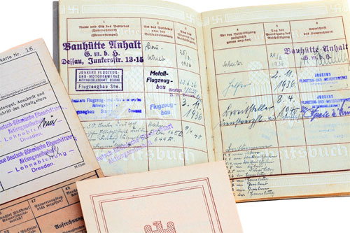 Three Identity Documents to Max Becker: Born July 7, 1909, DAF and Work Book have stamps and entries from 1936 to 1943, he was a skilled worker, employed at the Junkers Aircraft and Motors Factory at Dessau in 1941. Looks like Max went into the Army in March of 1942 due to the way Hitler squandered his soldier's lives on the eastern front. Excellent condition.