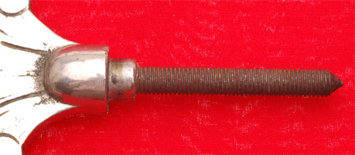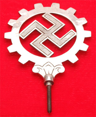 DAF Finial: A beautiful example, high quality nickle and chrome plated brass, geared swastika, 16 x 14 cm (5.5 x 6.5 inches), 370 gm (13 ounces), outlined and striped swastika, long sturdy 5 cm steel screw, very impressive chrome finish, perfect for making into a desk ornament with a cut off stained walnut pole, light to moderate wear.