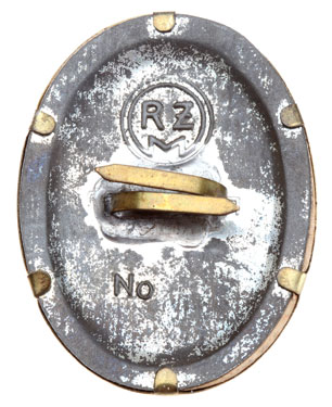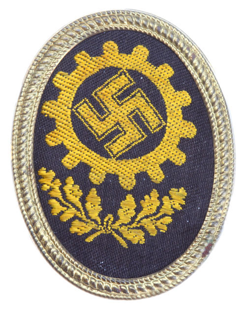 DAF Hat Badge: A nice multi piece oval badge, 50 x 40 mm, gilt brass oval frame, stamped steel back, gold on black rayon machine woven insignia, brass tabs and prongs, marked "RZM No," moderate wear.