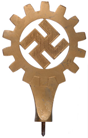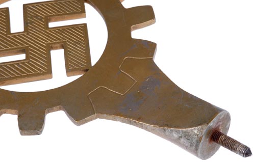 DAF Gold Honor Flag Pole Top: high quality, gold finish, solid nickel, 21 x 15 cm, 666 gm (1.46 pounds), outlined and striped swastika, lathe drilled and machined end, 2.5 cm steel screw, light to moderate wear, this one is priced about twice as much as the more common, light, plain looking versions - but it's worth it.