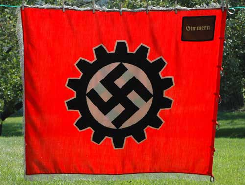 Standard Ortsgruppen flags have a tan colored corner patch with blue piping. This is a Kreis level DAF flag that has a redish brown corner patch with black trim, which is the color for Kreis level prior to the introduction of the 1939 uniform insignia.
