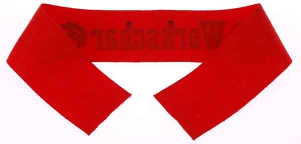 Gau-Werkscharfuhrer: This is a Gau level insignia, 4.4 x 39 cm red rayon with black printed letters, mint unissued condition.