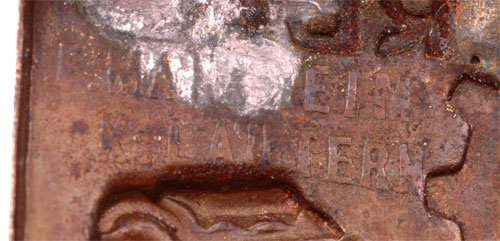 Romerbad: This badge appears to celebrate the DAF building a replica of a Roman Bath House for the local festival. Needs research. Bronze plated steel, 30 x 42 mm, soldered pin, maker: F. Mannheim K.-Lautern; scarce, light wear.